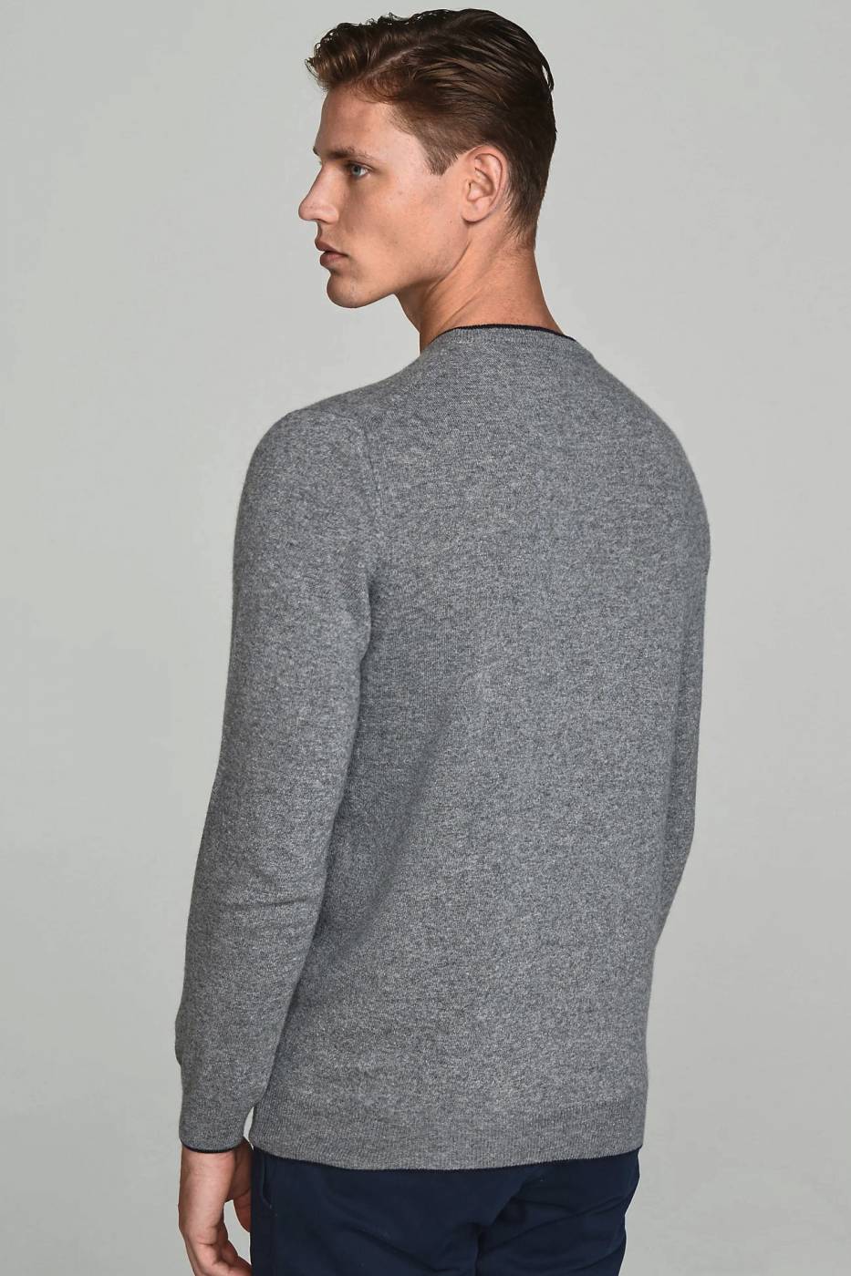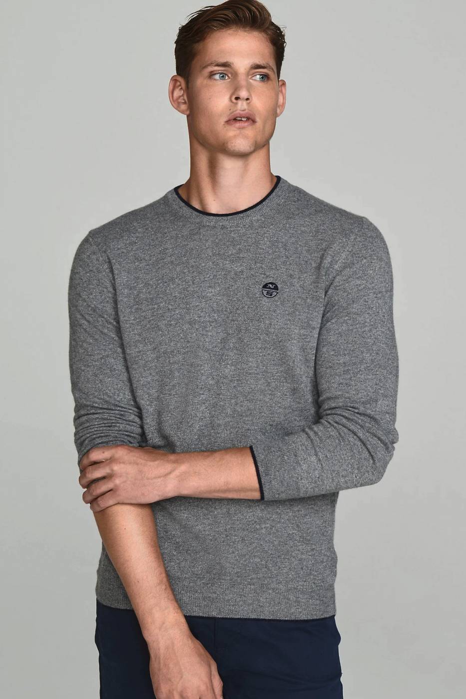 Maglia girocollo grigio in lana e cachemire con logo ricamato sul petto. Bordini a contrasto blu su collo e polsini.