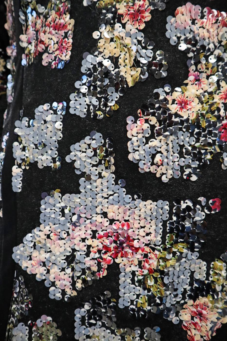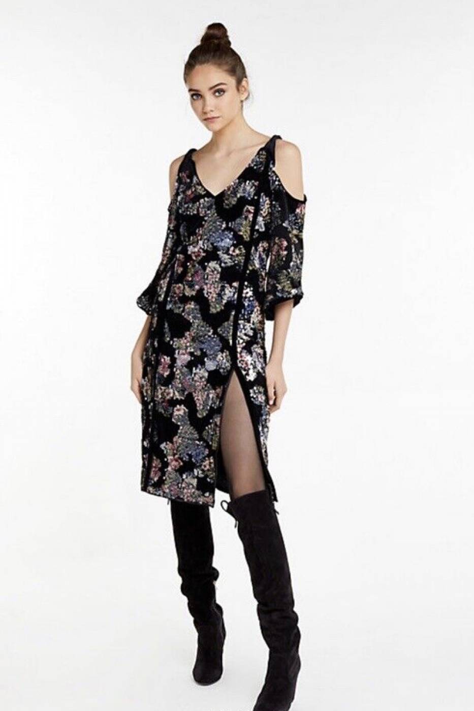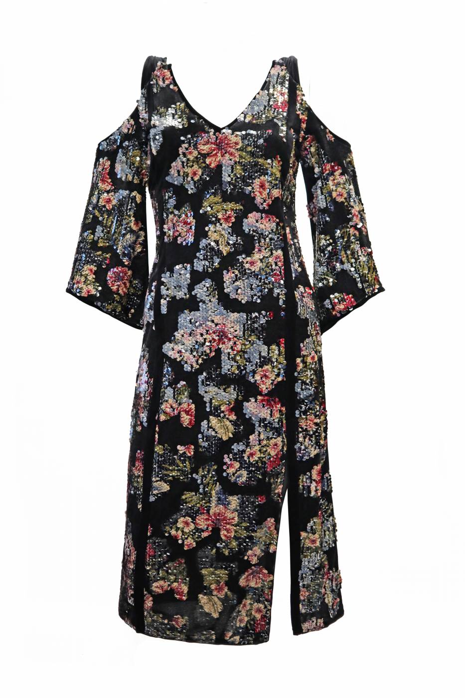 Abito in velluto con spalle scoperte, decorazioni in paillettes e spacco