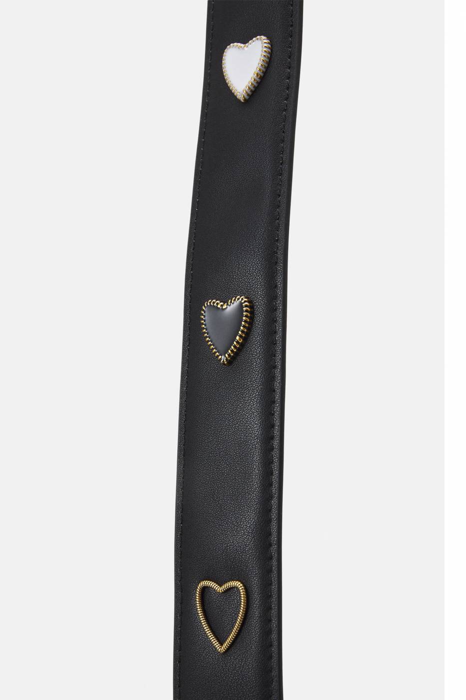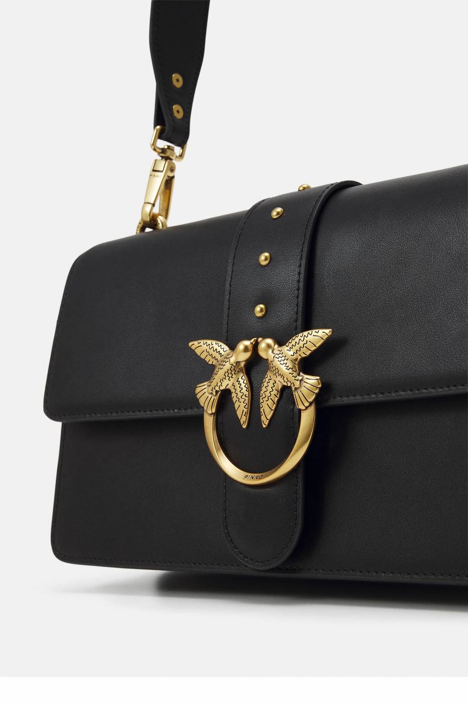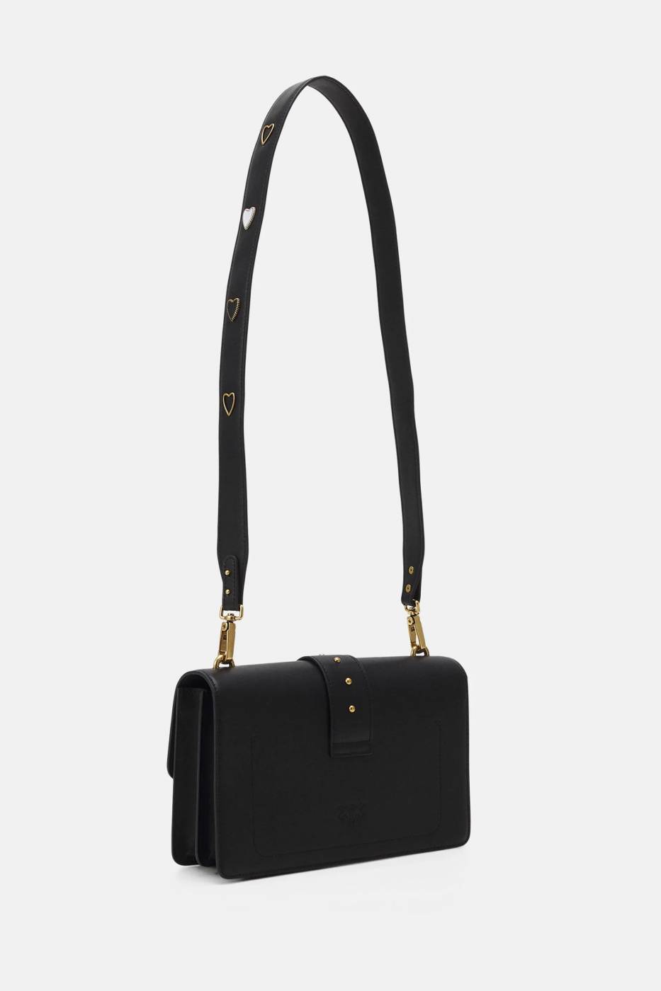 Borsa tracolla Love Classic Icon in pelle nera con tracolla tono su tono con borchie cuore, sul davanti patta con fibbia rondini oro e chiusura con bottone automatico.