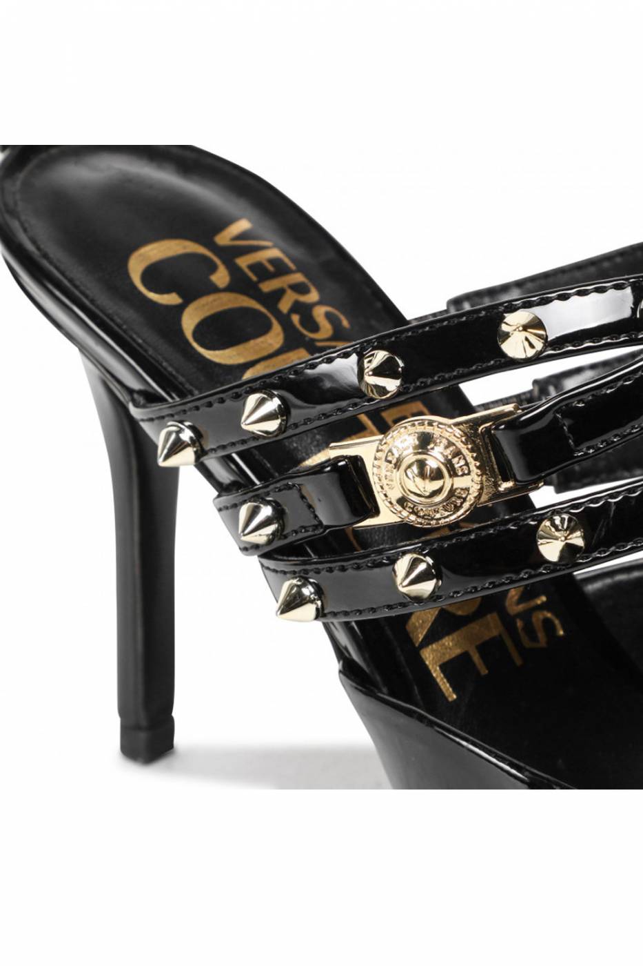 Sandali Versace Jeans Couture lucidi a punta con cinturino e borchie.