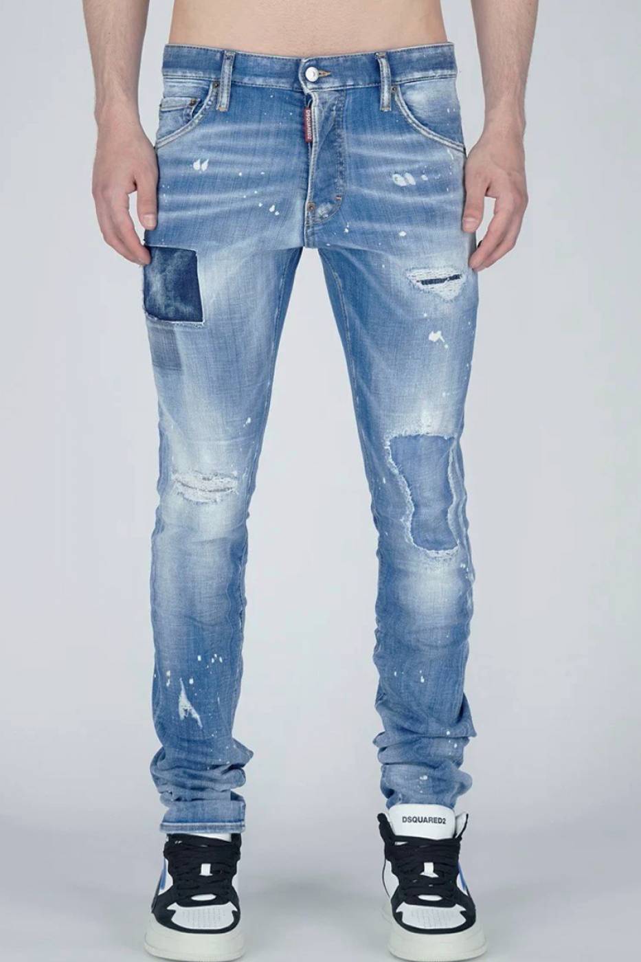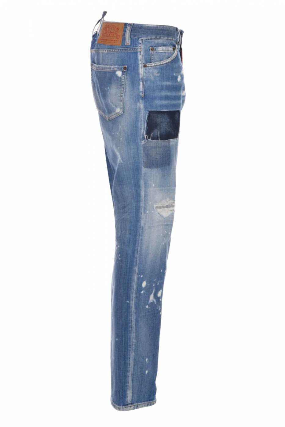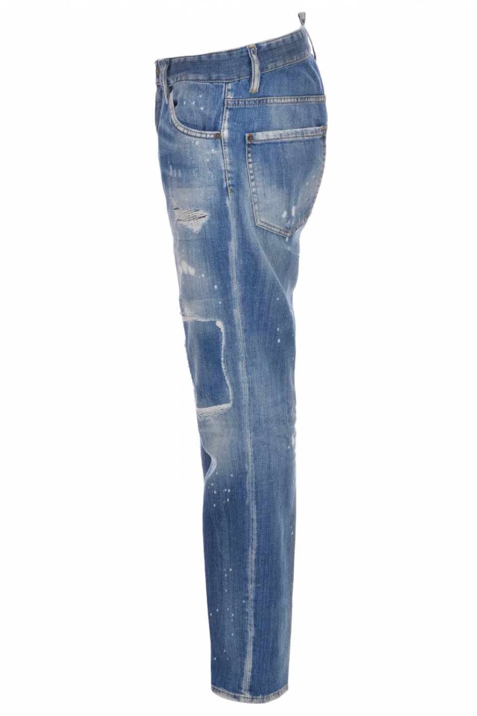 Jeans da uomo Dsquared cool guy modello 5 tasche realizzato in cotone e caratterizzato da punti di usura e cuciture rinforzate.