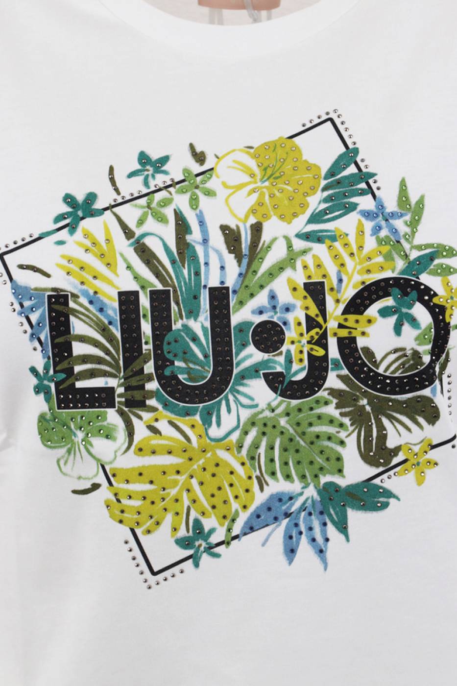 T-shirt donna Liu-Jo in cotone, maniche corte, girocollo, logo e strass in applicazione sul davanti.