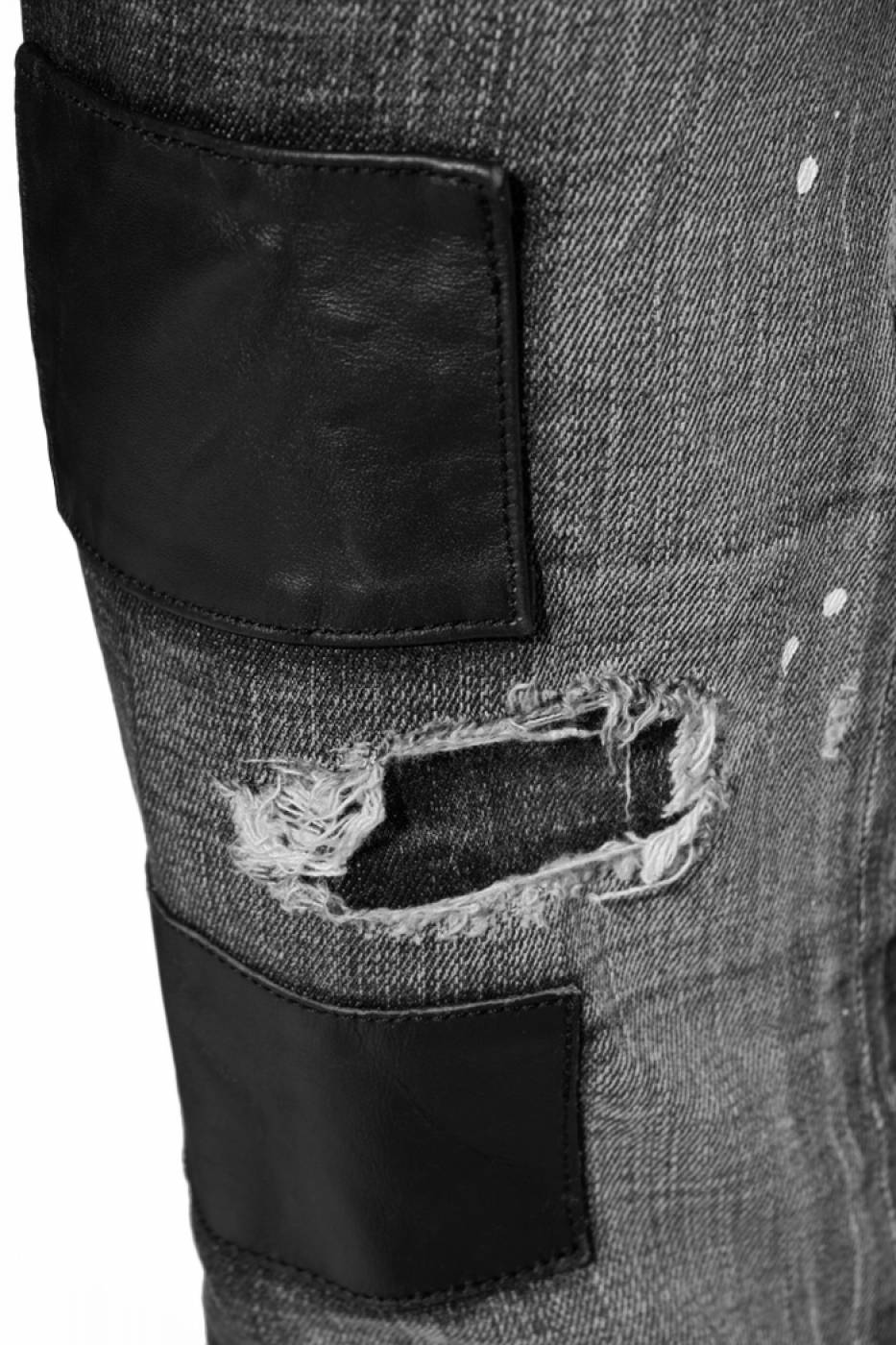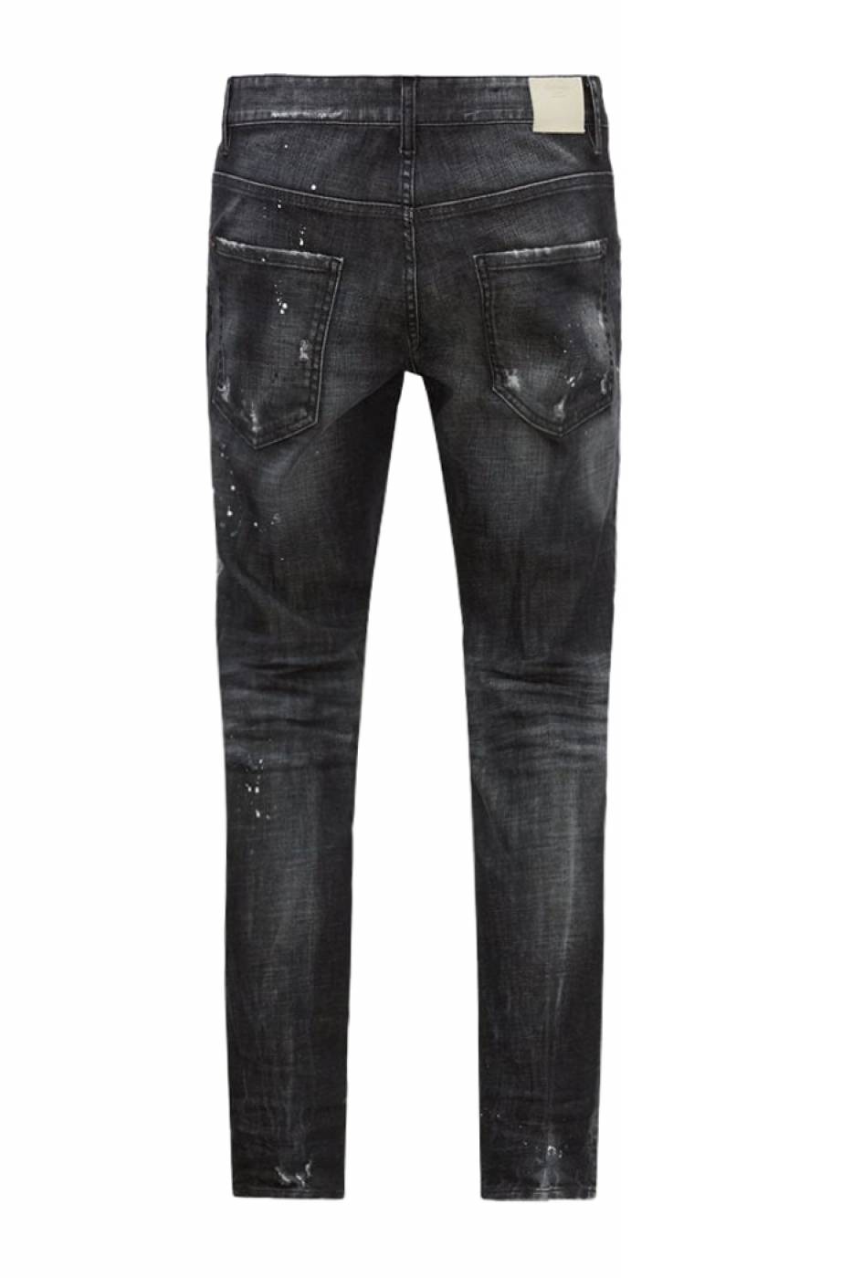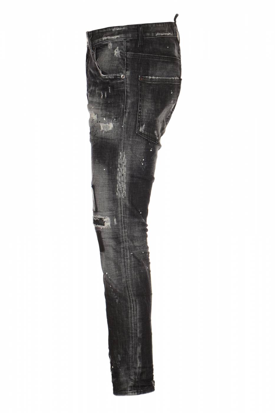 Jeans Dsquared2 con chiusura a bottoni, vestibilità regolare, modello con finti strappi e toppe in similpelle, lavaggio scuro.