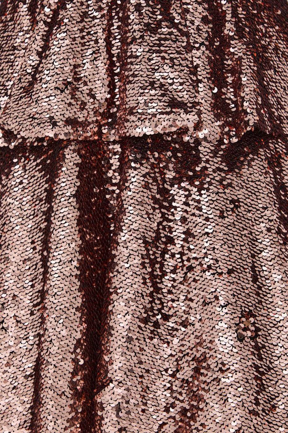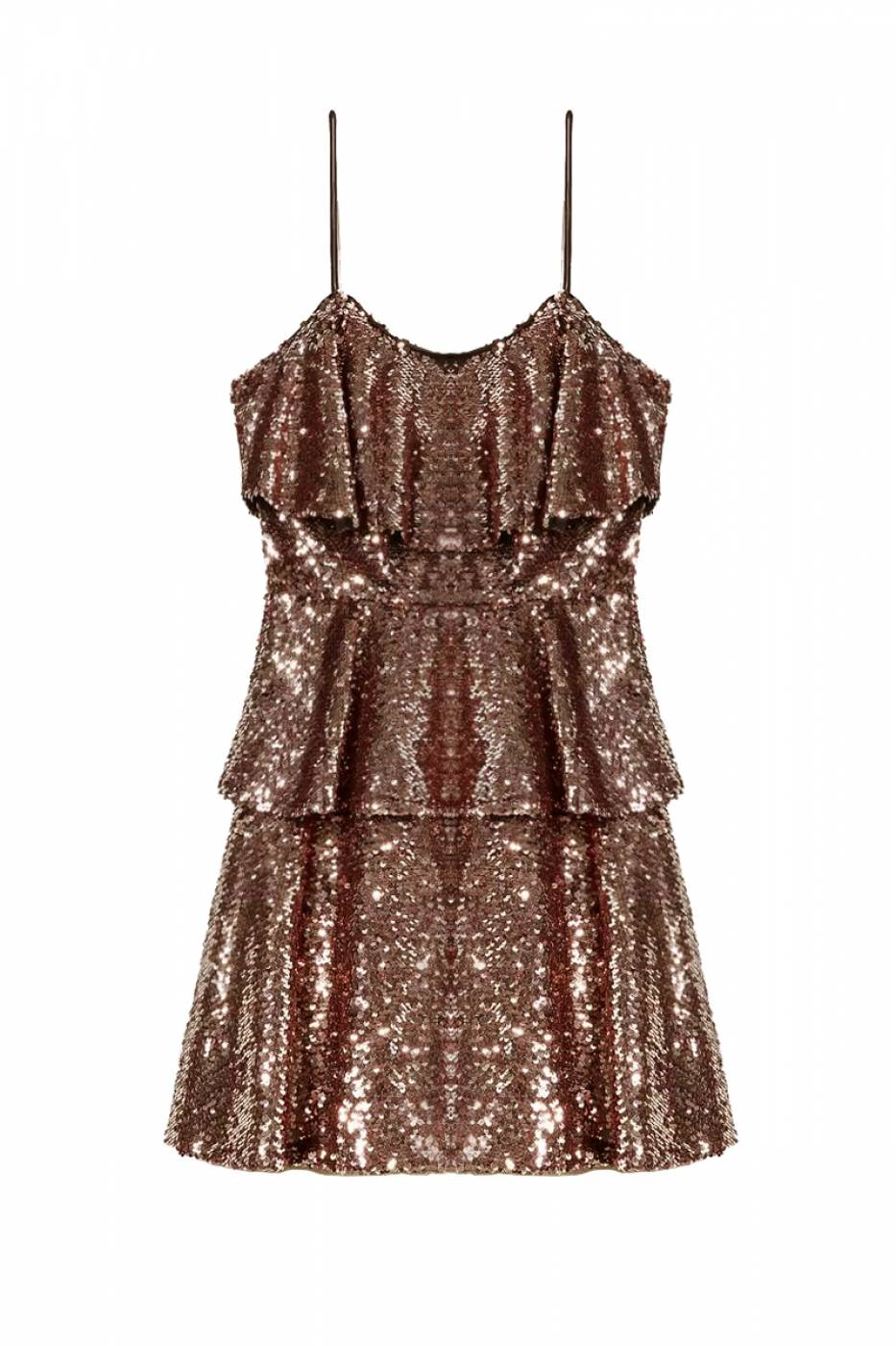 Abito corto in full paillettes con balze, zip invisibile, foderato.