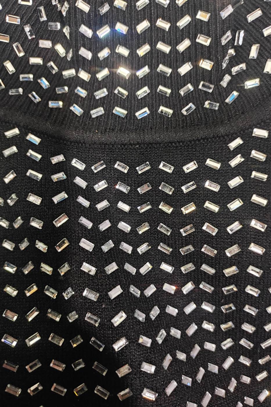 Abito in maglia misto viscosa con strass, collo alto senza maniche, vestibilità aderente.