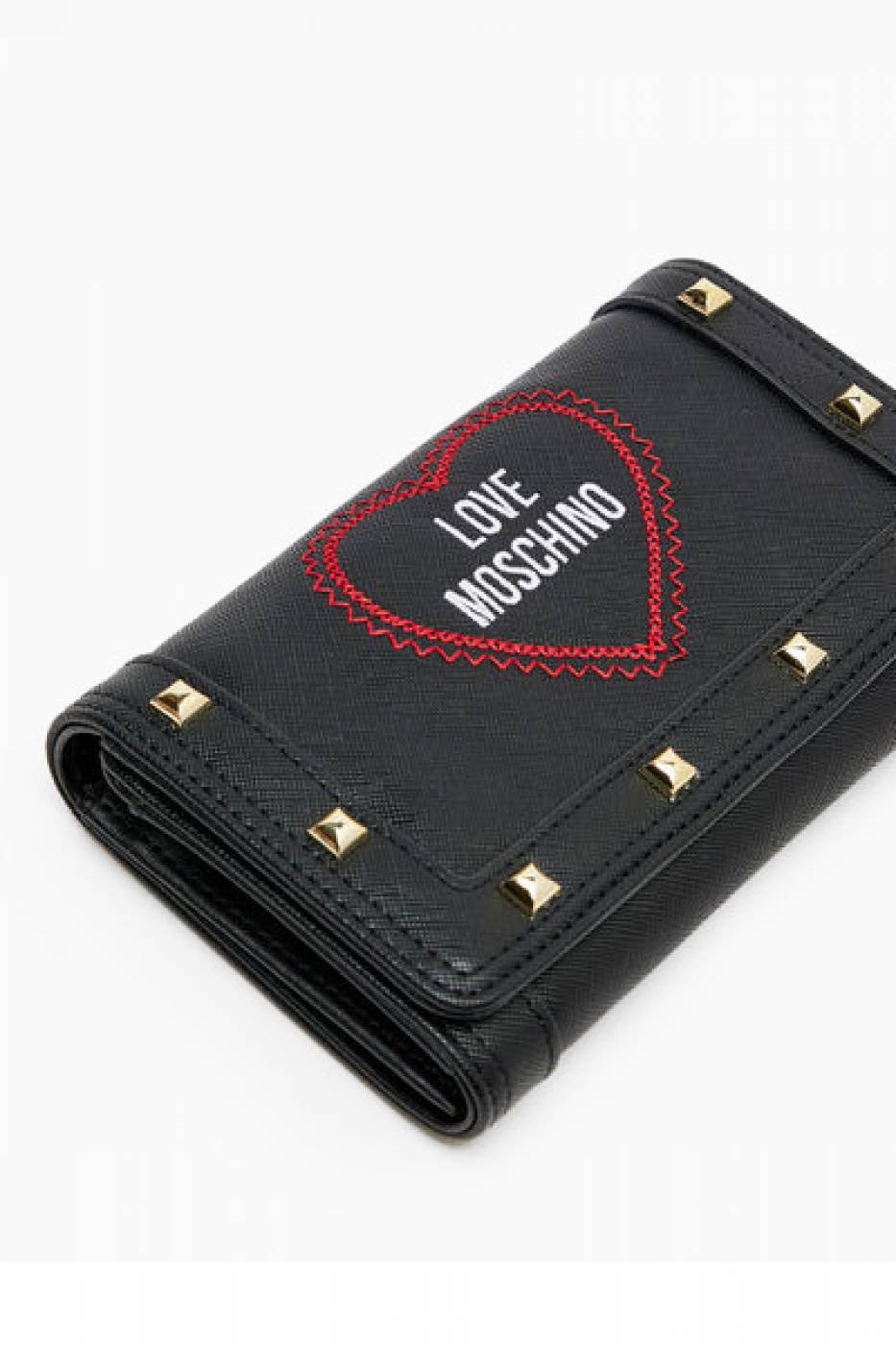 Portafogli Love Moschino in saffiano nero con logo e borchie. Misure:16.5 x 9 cm x 3.5