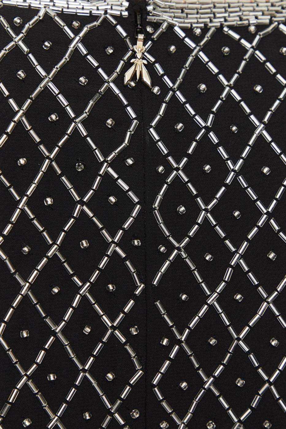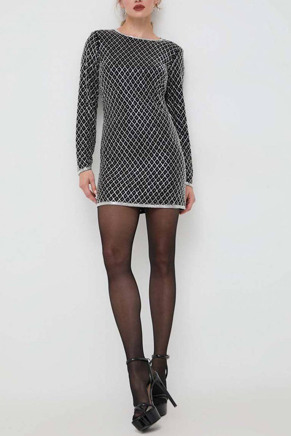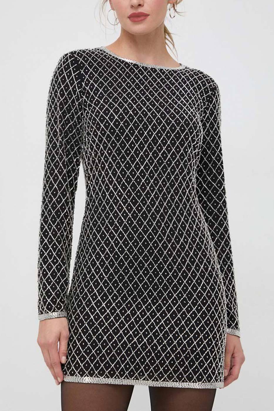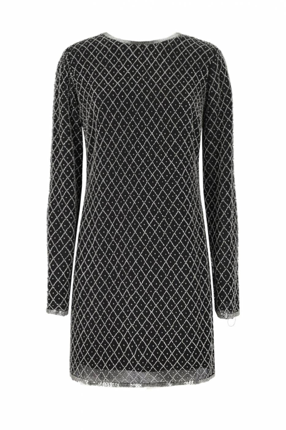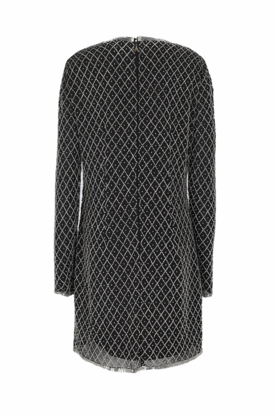 Abito con paillettes e perline, scollo rotondo e maniche lunghe, chiusura sul retro con zip nascosta.