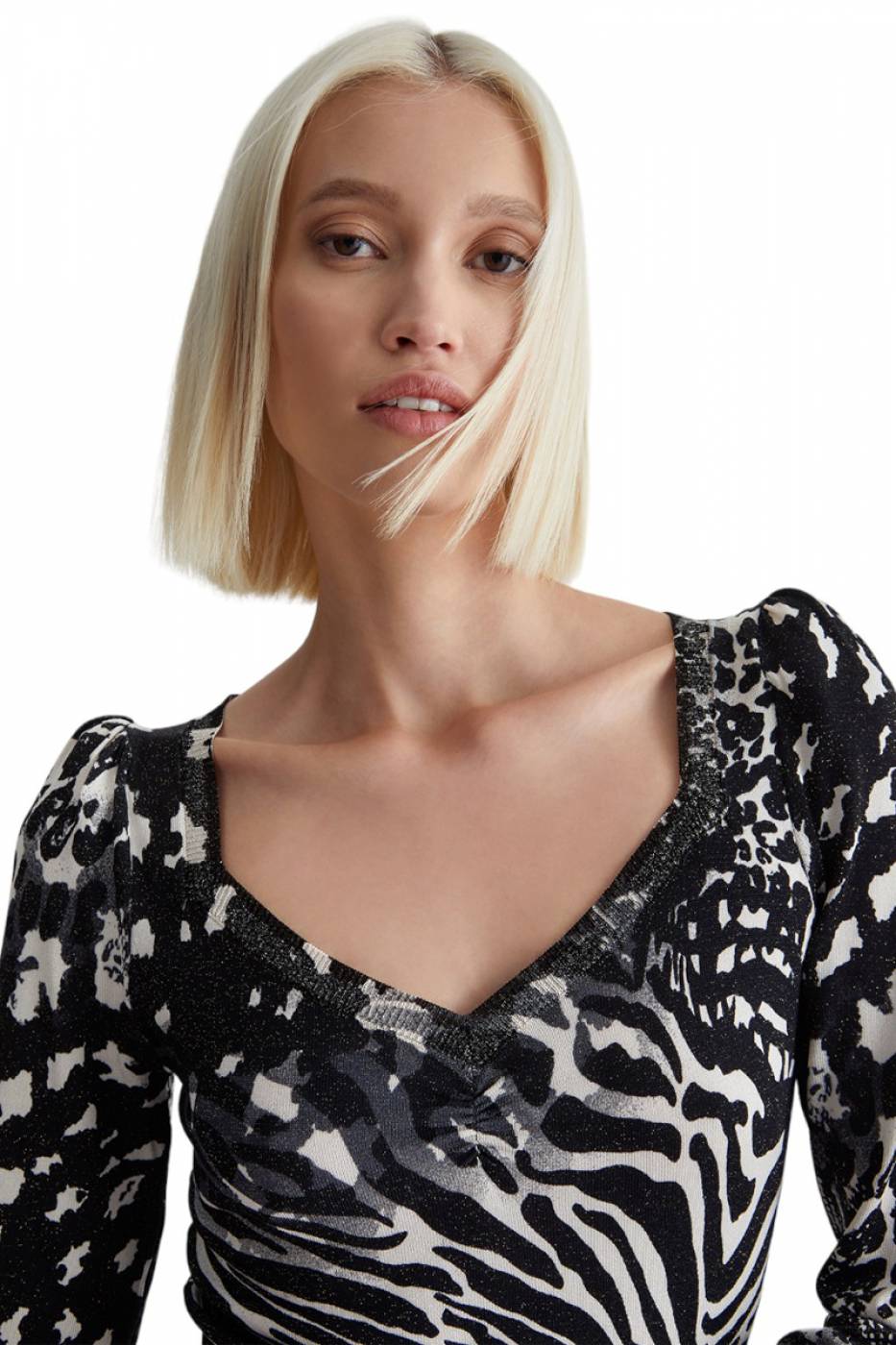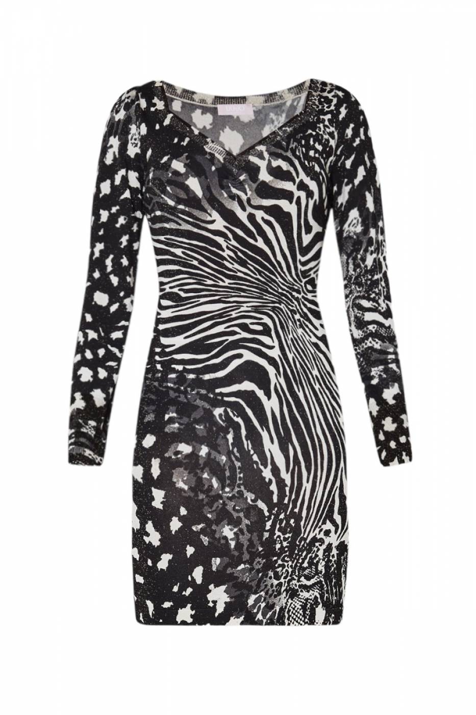 Abito corto in misto viscosa, stampa animalier all over, maniche lunghe, scollo a V. Bordi rifiniti a costine.