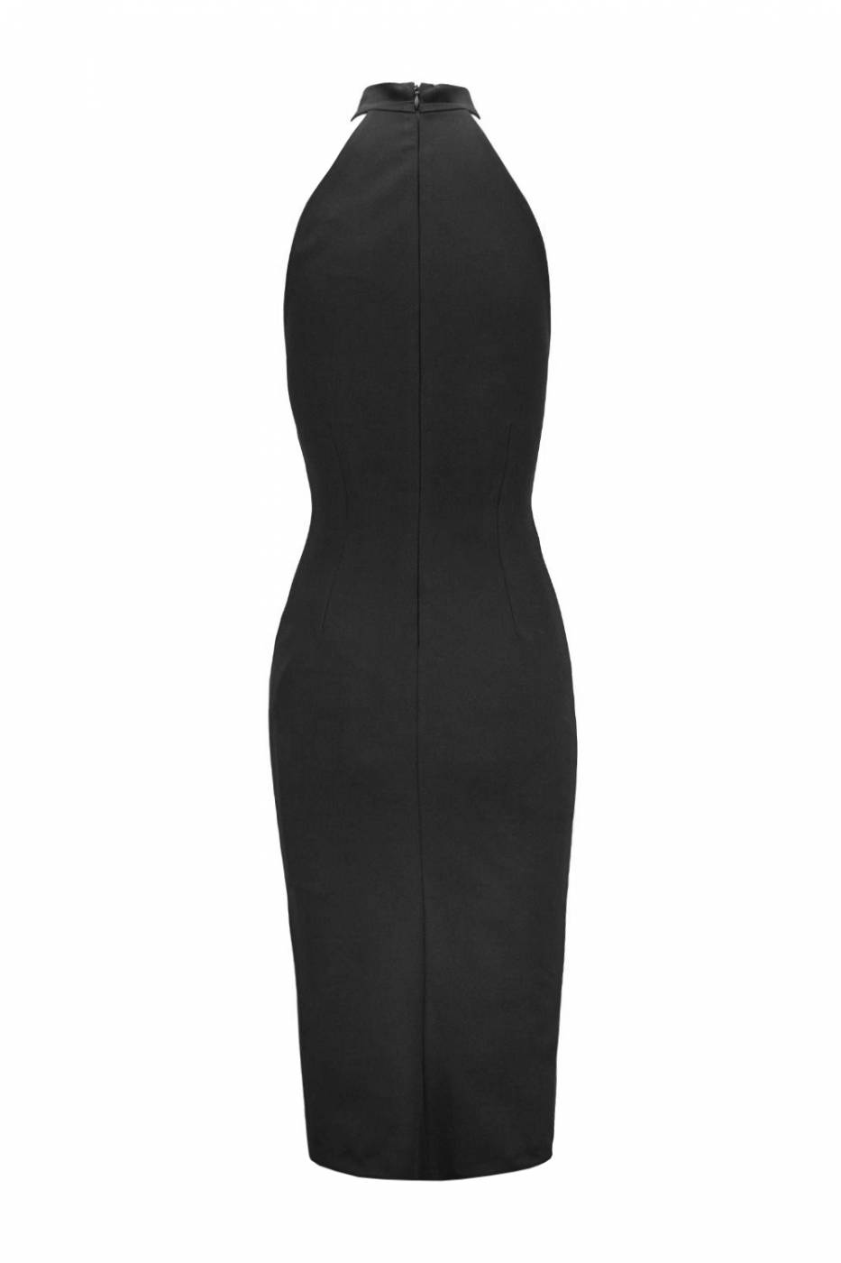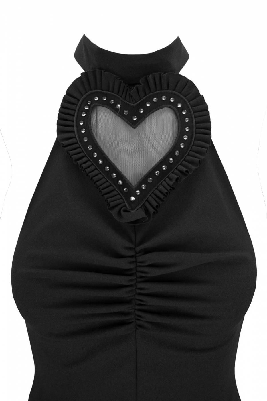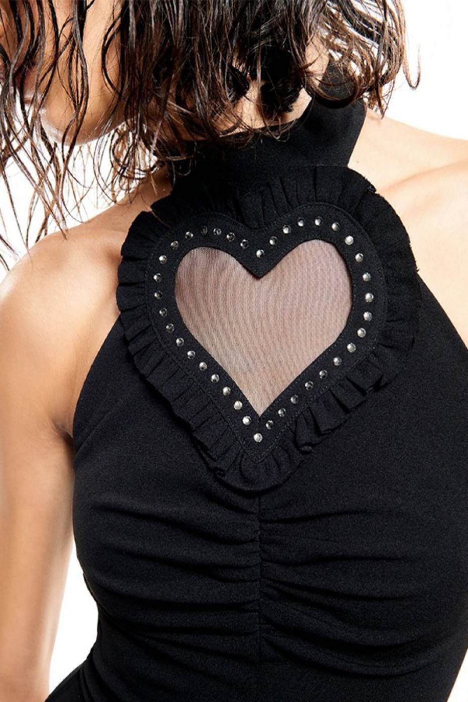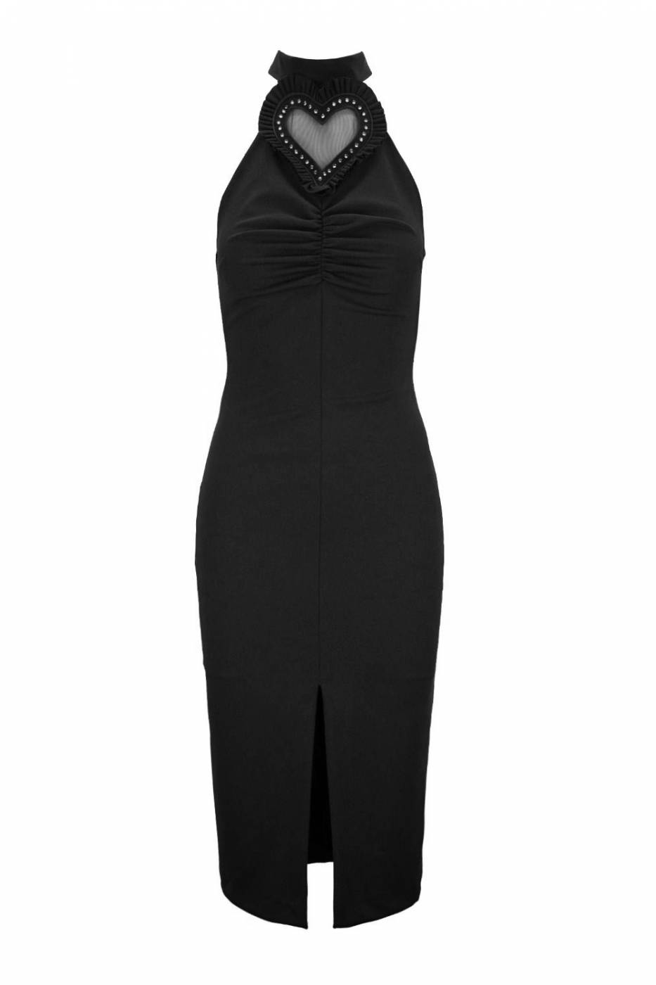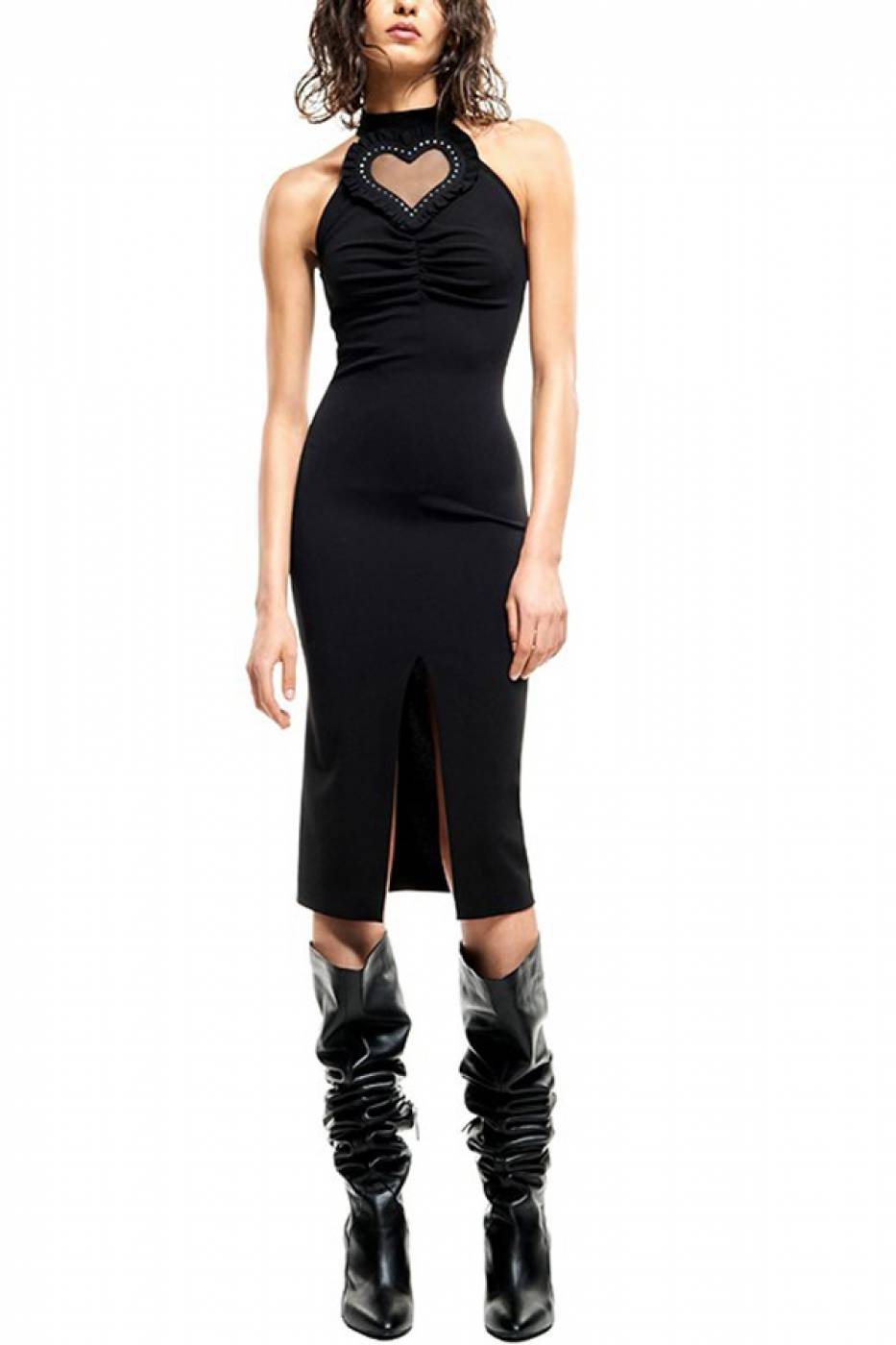 Abito midi a tubino aderente, con spacco sul davanti e dettaglio cuore in trasparenza.