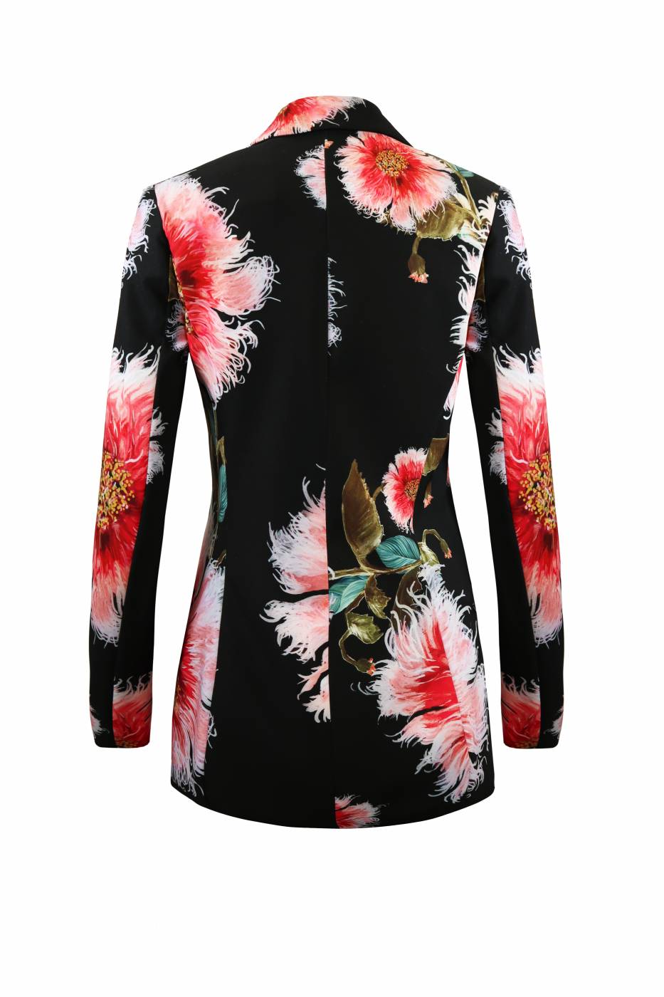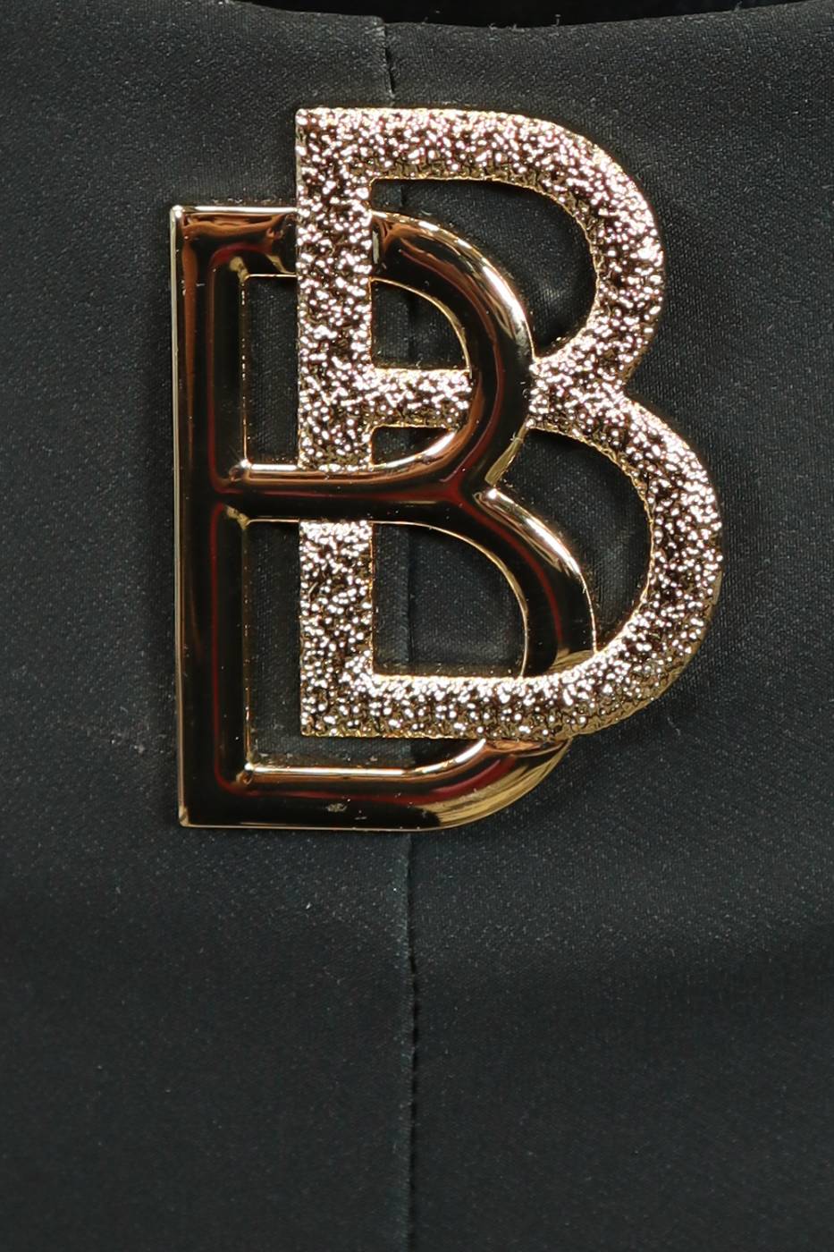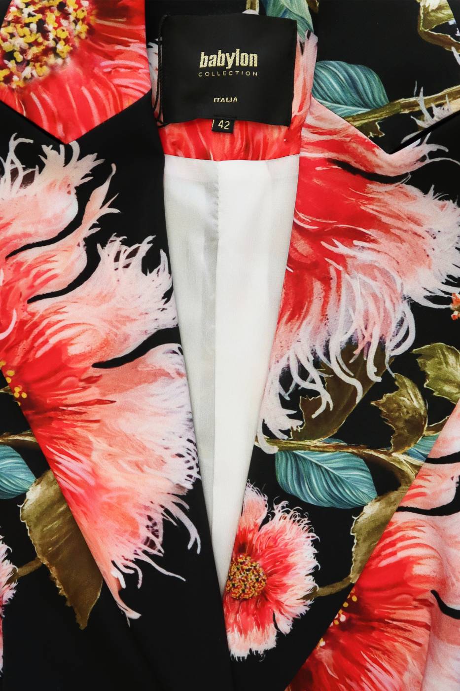 Tailleur nero con fantasia floreale, logo Babylon sul pantalone.