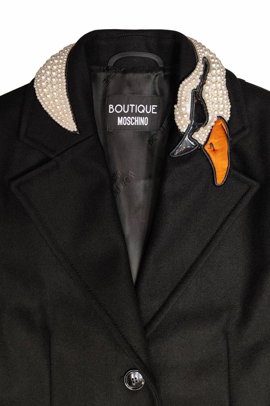 Cappotto Boutique Moschino in panno di lana, con decorazione sul collo con perle e raso.