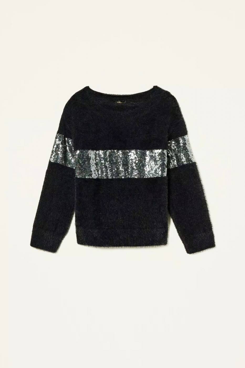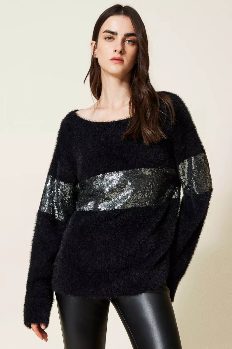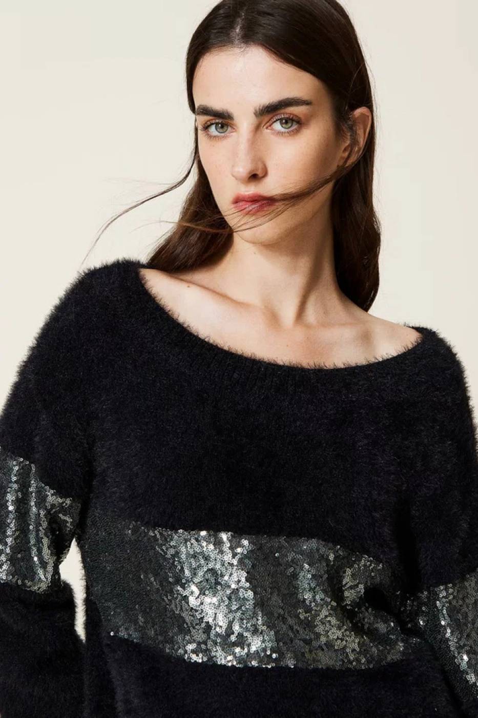Maxi maglia collezione Actitude lavorata in punto pelliccia con applicazione di tulle con ricamo di paillettes.