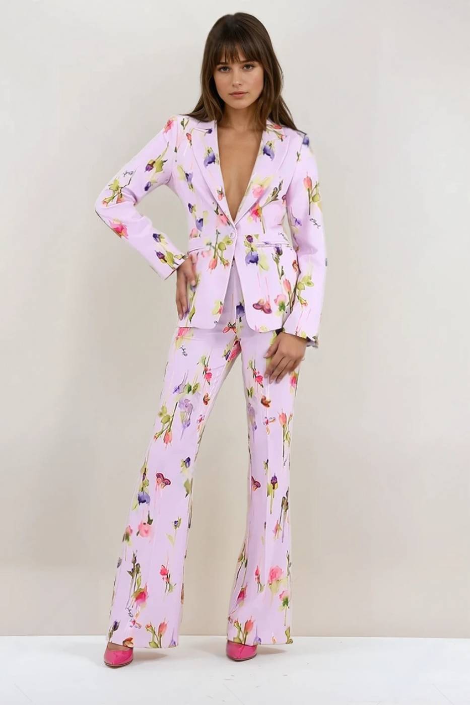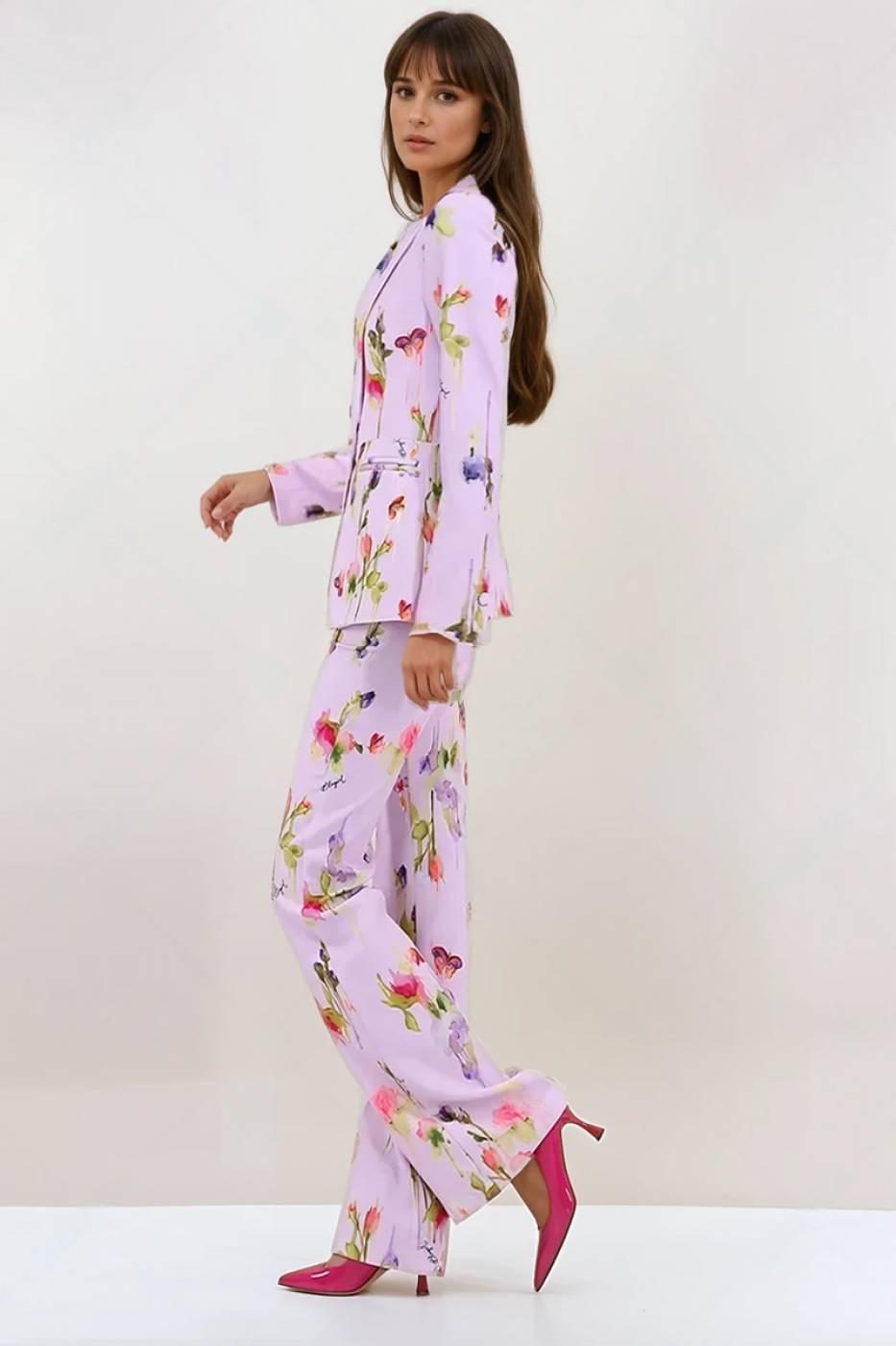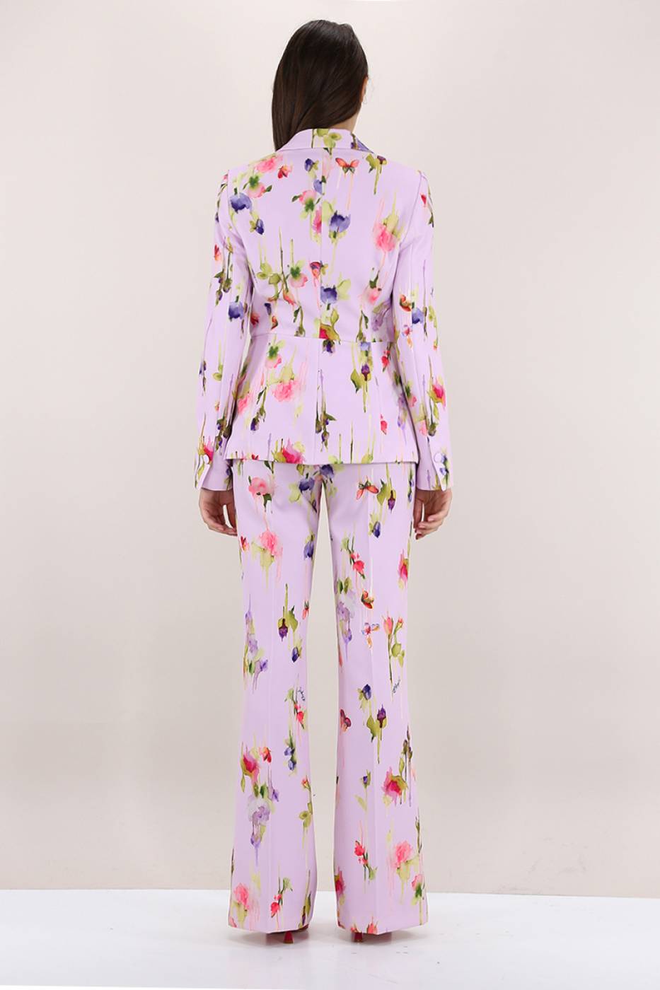 Tailleur Blugirl color lilla con motivo floreale. Composto da giacca slim fit e pantalone svasato.