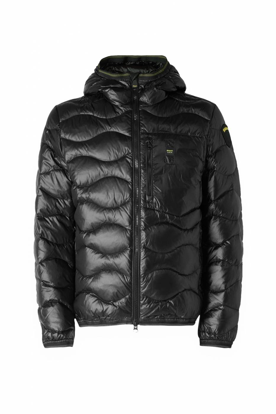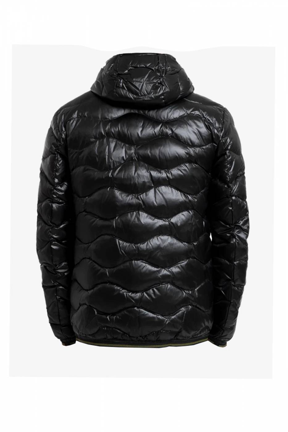 Piumino trapuntato ad onde orizzontali. Taschina applicata sul petto. Imbottitura naturale in piuma 90/10 gr.165. Cappuccio fisso. Chiusura con zip. Tasche con zip.