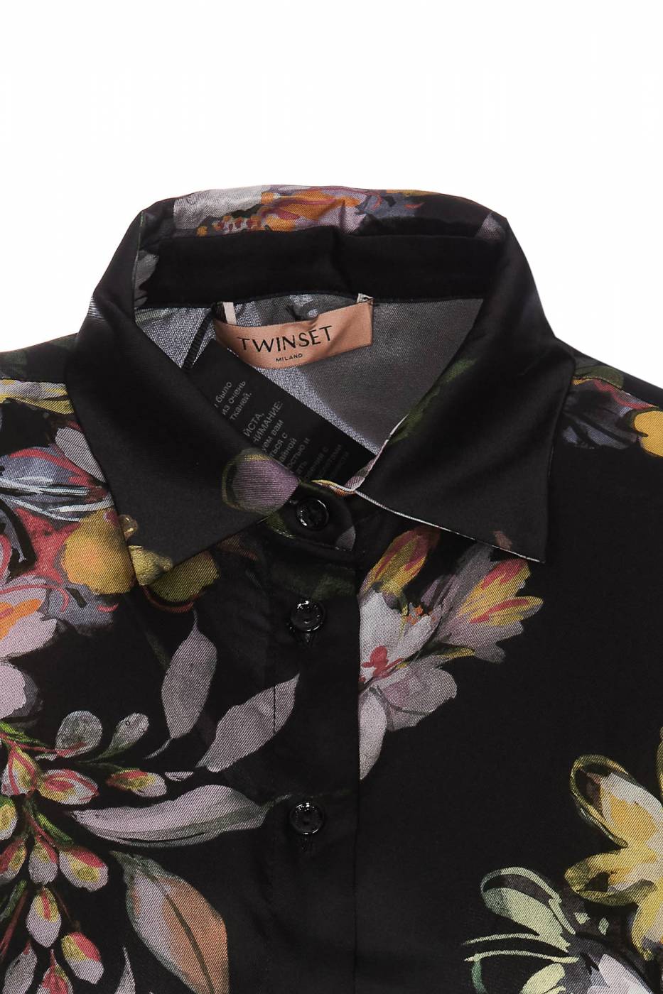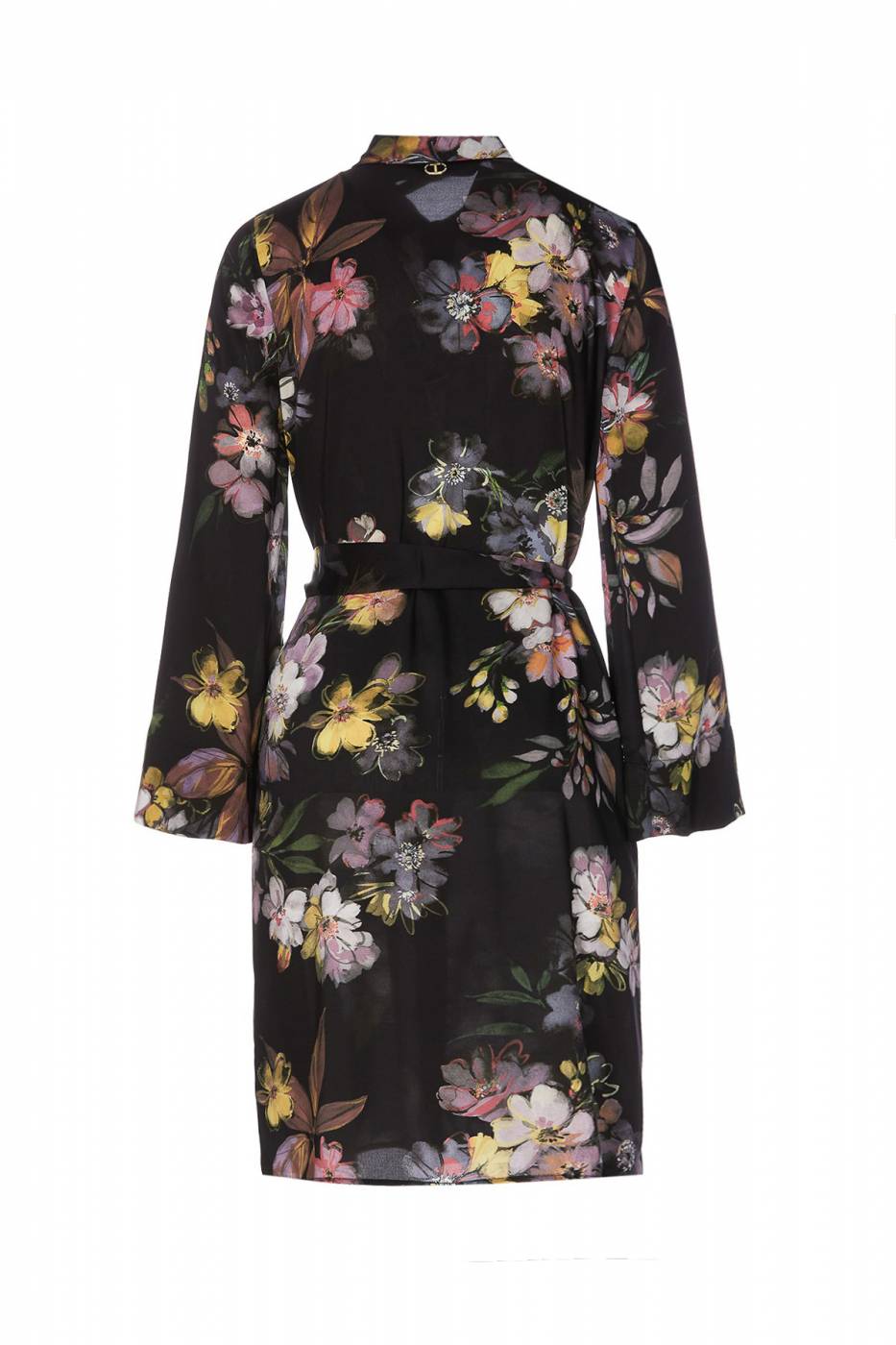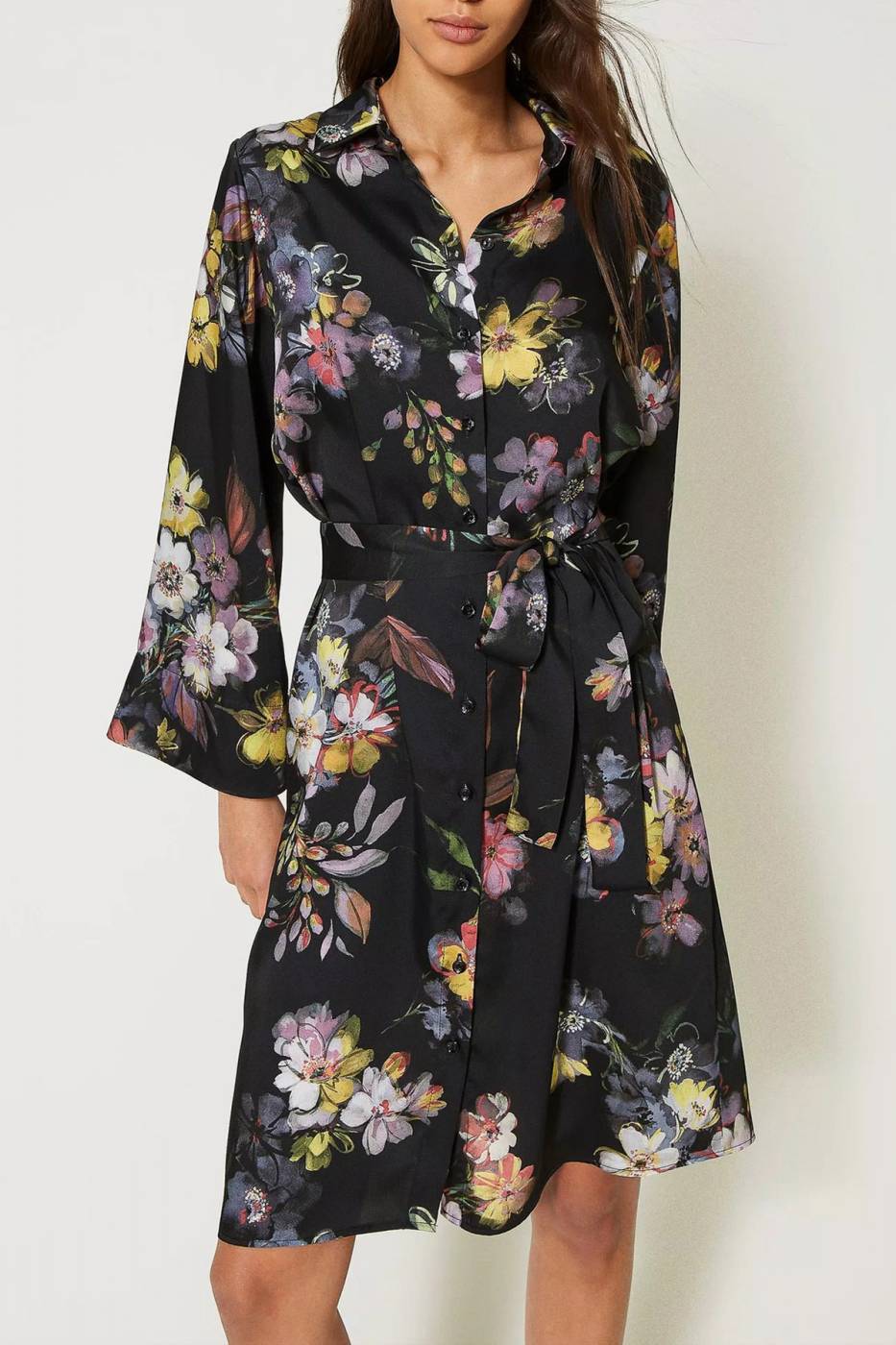 Abito corto chemisier in twill a fiori con cintura.