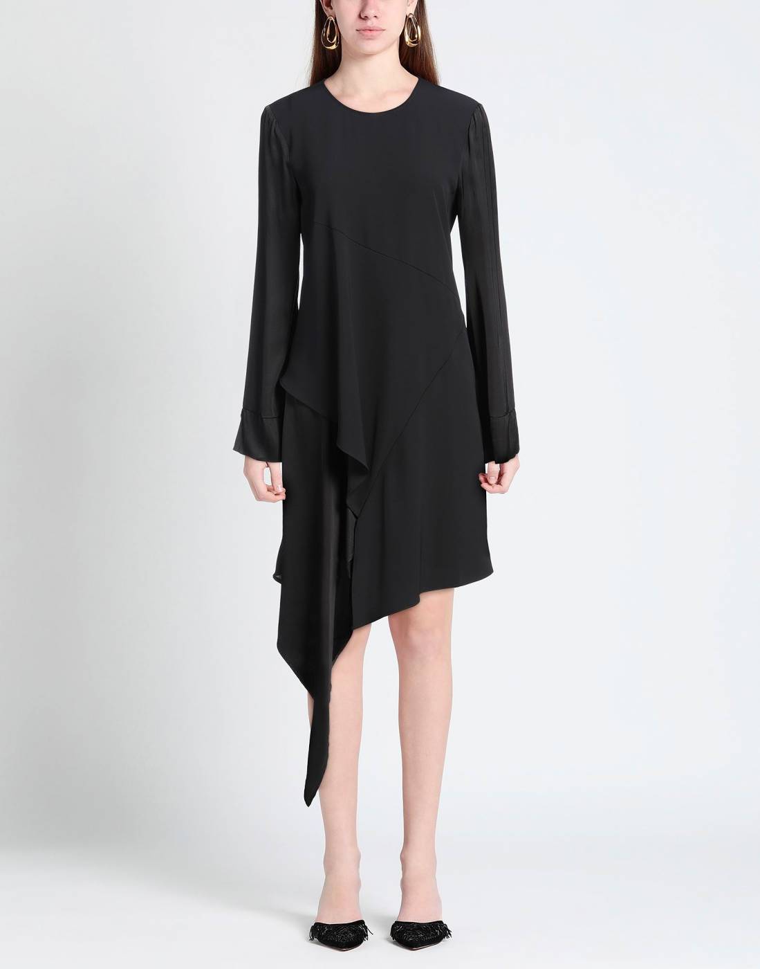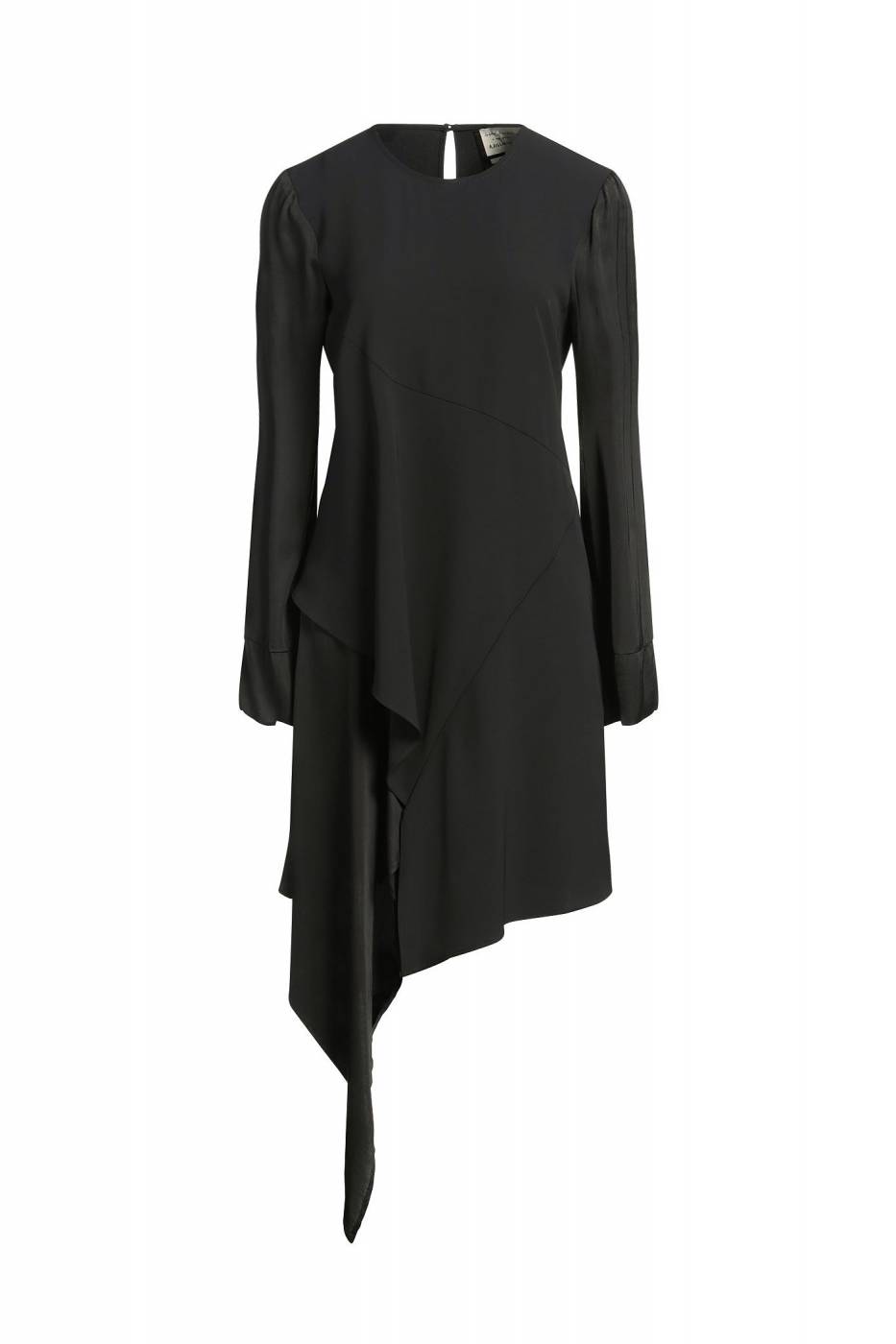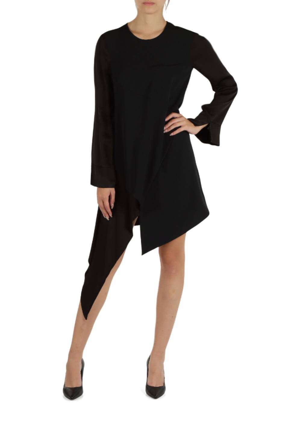 Abito in viscosa asimmetrico con inserti a contrasto in raso.