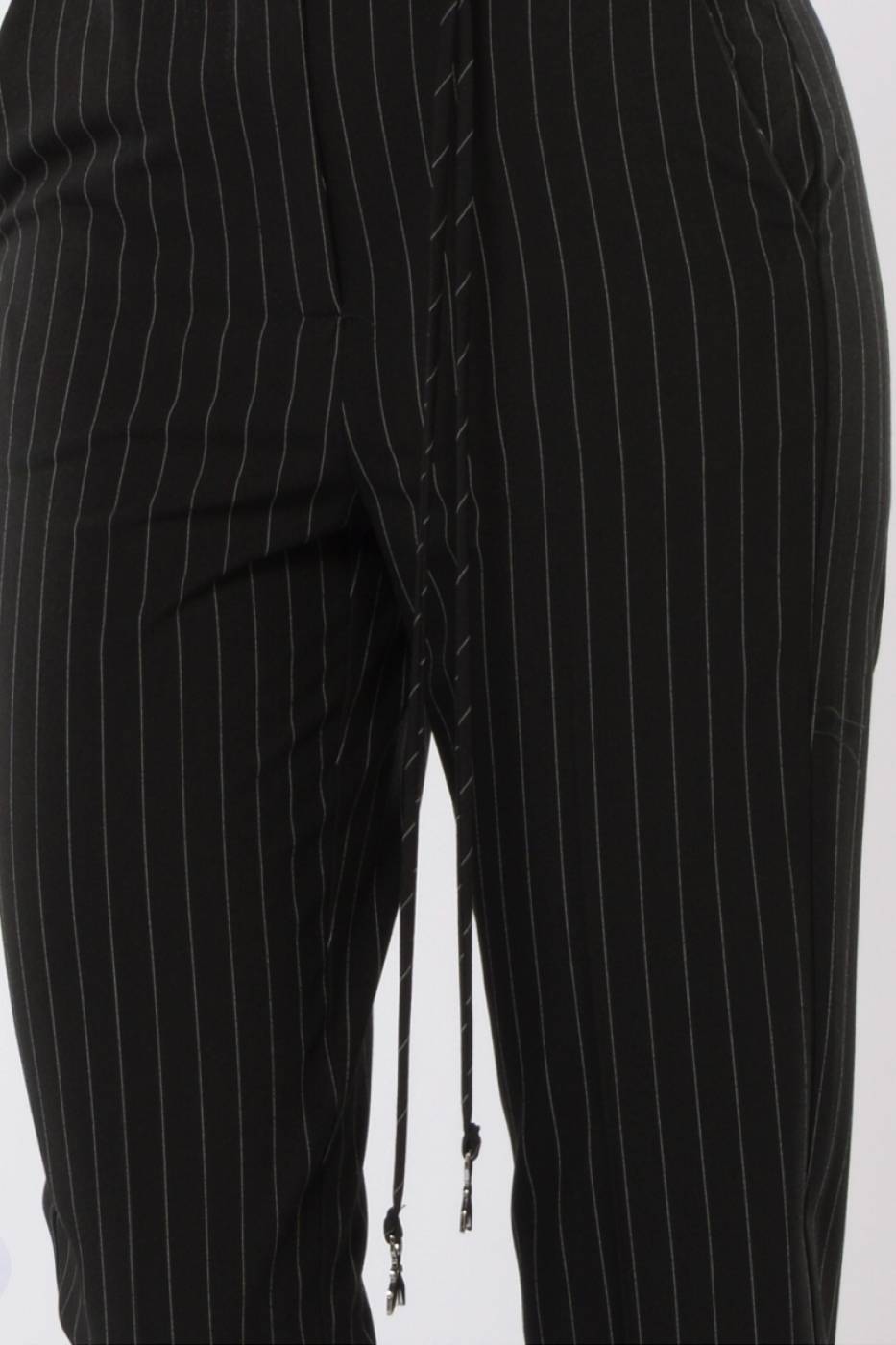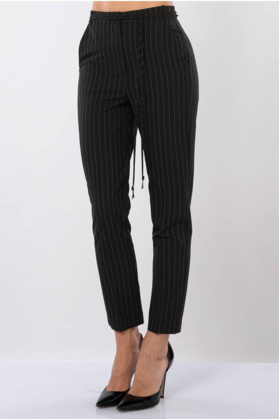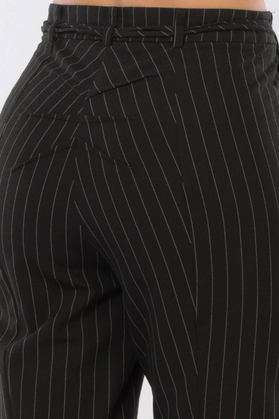 Pantalone gessato a vita alta, cinturino in tessuto con dettaglio logo fly in metallo.