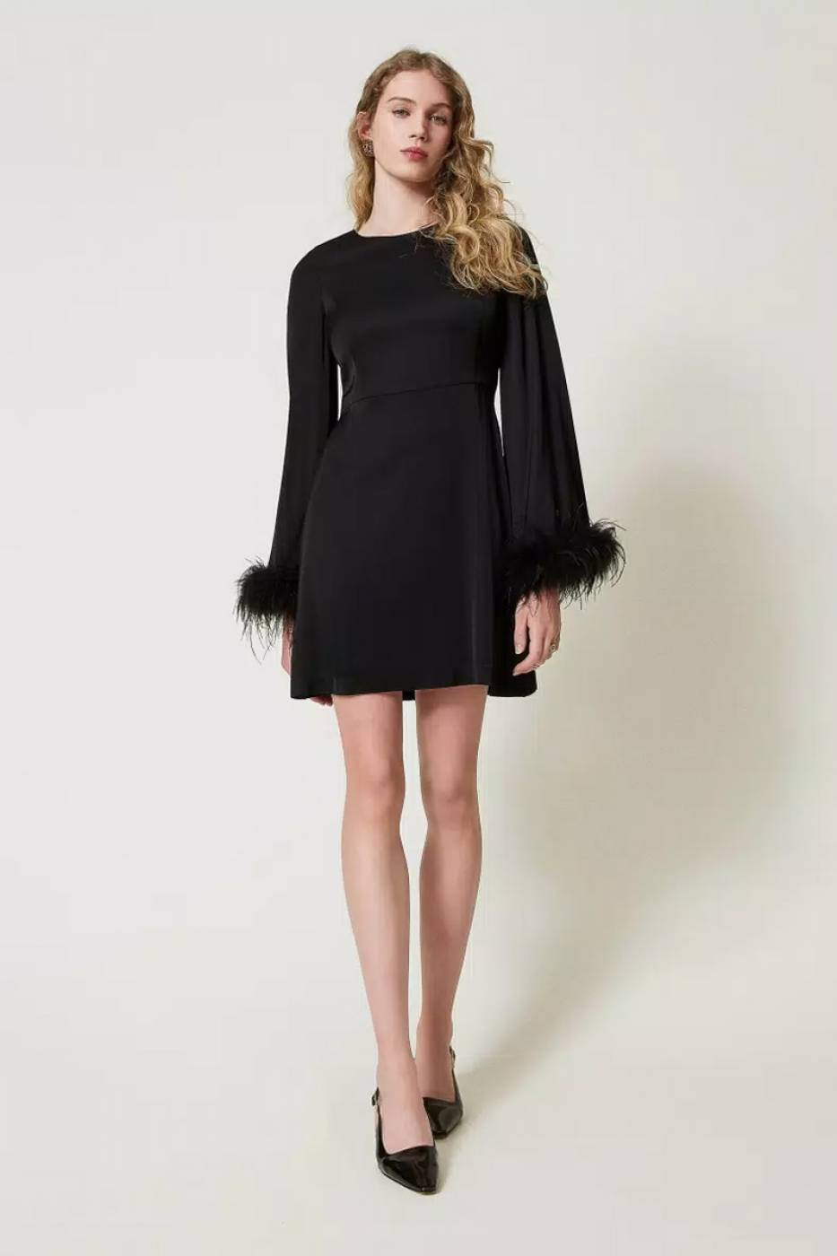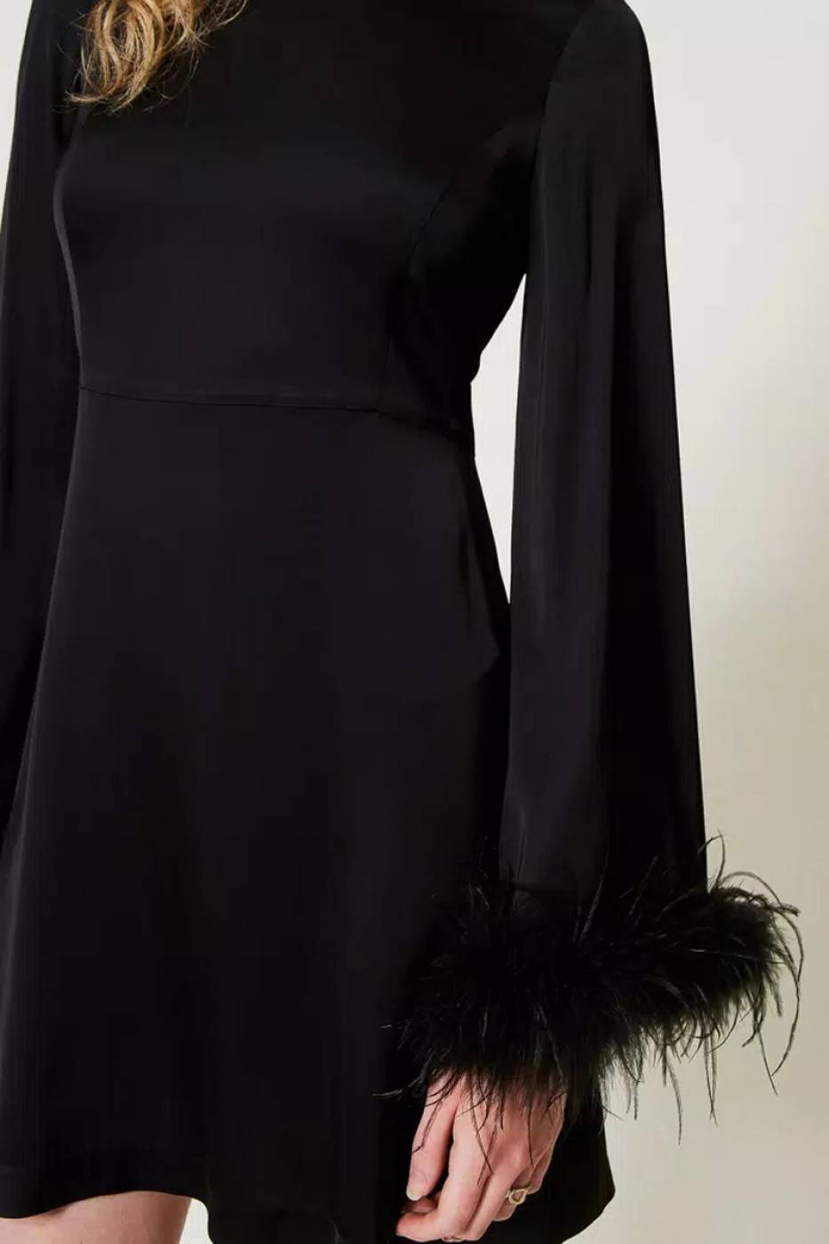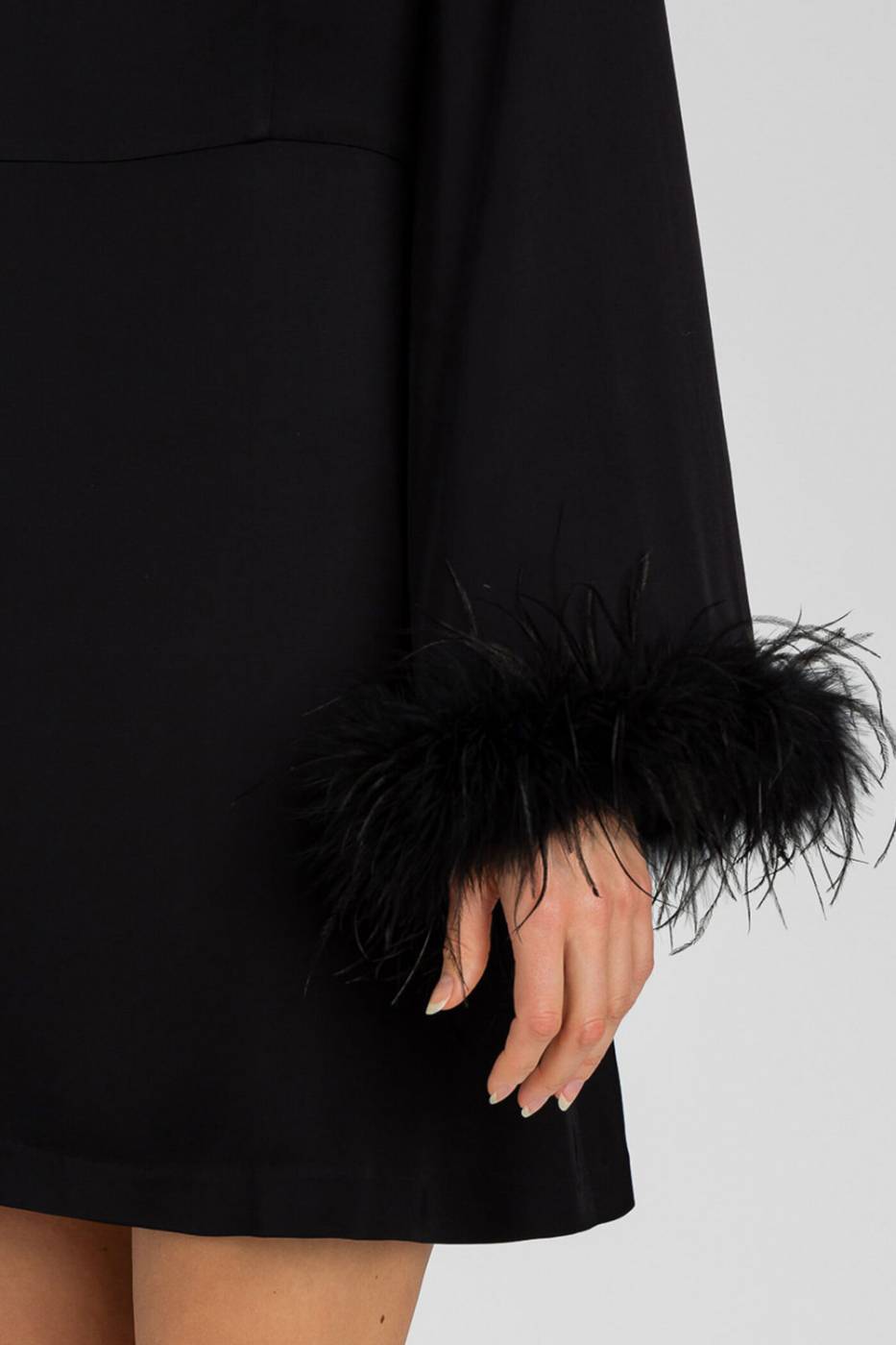 Abito corto in raso di viscosa con polsi rifiniti da torchon di piume in tono applicato a mano. Collo tondo, maniche lunghe ampie, taglio in vita, chiusura con zip e placchetta logo sul retro, foderato, linea morbida.